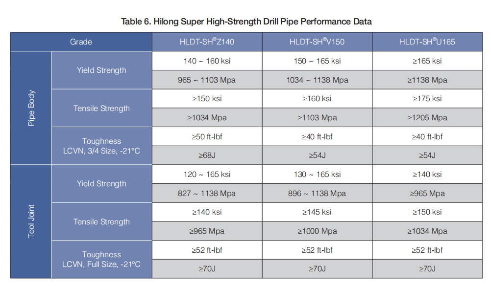 Hilong super high-strength steel grades HLDT-SH®Z140, HLDT-SH®V150 and HLDT-SH®U165 are proprietary products which designed specifically for deep and ultra-deep wells, extended reach drilling (ERD) wells, deep offshore and other critical drilling applications. With a special chemistry composition and carefully designed heat treatment process, HLDT-SH®Z140, HLDT-SH®V150 and HLDT-SH®U165 grades have realized high strength, high toughness and improved fatigue resistance.