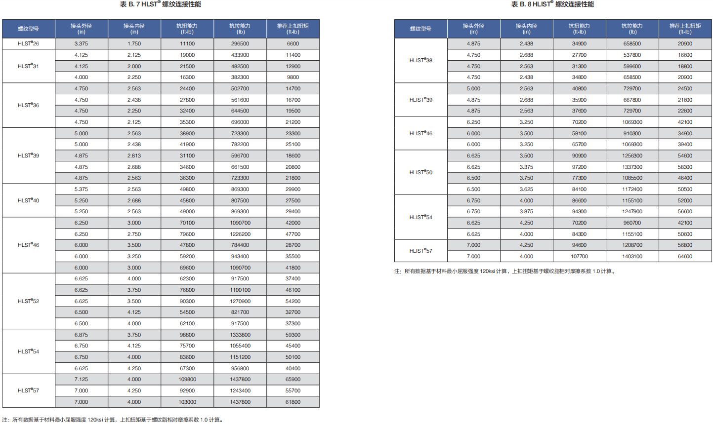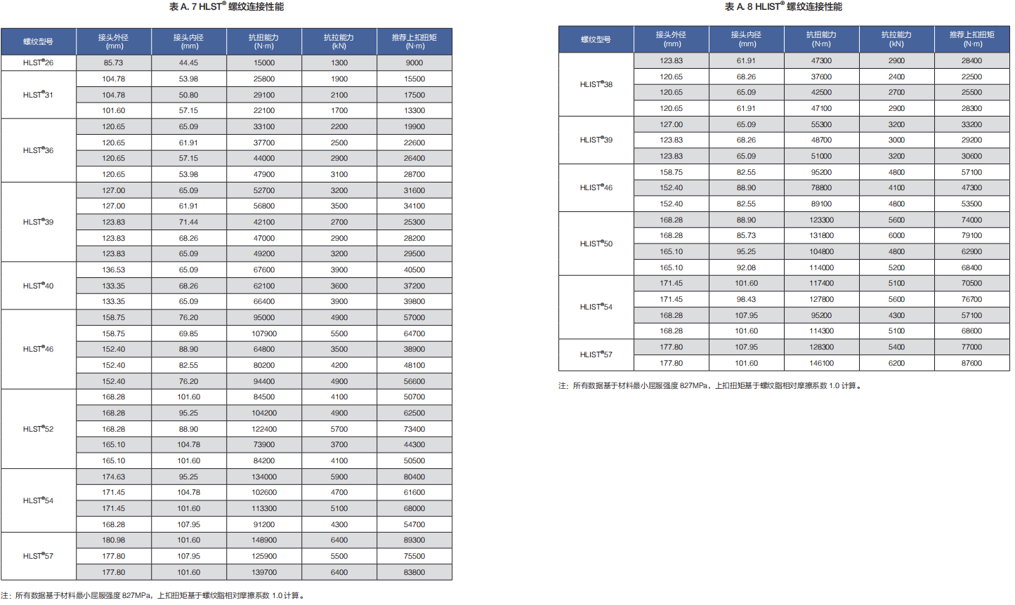 HLST® 螺紋連接性能表請見表 A.7 或表 B.7。